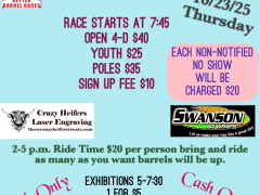 Follow BMB Productions on Facebook Ride time 2-5 Exhibitions 5-7:15 Open 7:30 Barrels and Poles Open $40 Side Pots $25 Youth Adult 10 U Poles $40 Ride time $20 per… Read more »