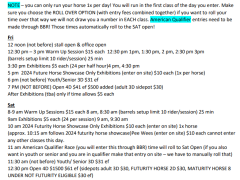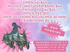 Barrel Racing Babes Winter Jackpots! OPEN 4D $45 NOVICE (NOT OVER $500) $40 YOUTH (UP TO 14) $25 OFFICE FEE $10 RIDE SESSIONS $15 (10 PER 30 MIN) EXHIBITIONS $5 … Read more »
