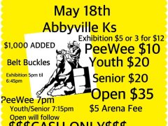 Turn N’ Burn Barrels May 18th Abbyville, KS Exhibitions $5 or 3 for $12 $1,000 ADDED Belt Buckles Exhibitions 5pm til 6:45PM PeeWee $10 Youth $20 Senior $20 Open $35… Read more »