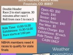 NBHA CO 06 April 1, 2023 April 30, 2023 5 Star Equestrian Center 18550 Midway Ranch Road Fountain, CO 80817 Double Header Race 2 to start approx. 30 minutes… Read more »