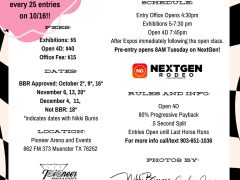 Exhibitions 5-7:30 pm $5 Open 4D 7:45 pm $40 Office fee $15 80% Progressive Payback .5 second Split Entries open until last horse runs For more info call/text 903-651-1036 Pre-entry… Read more »